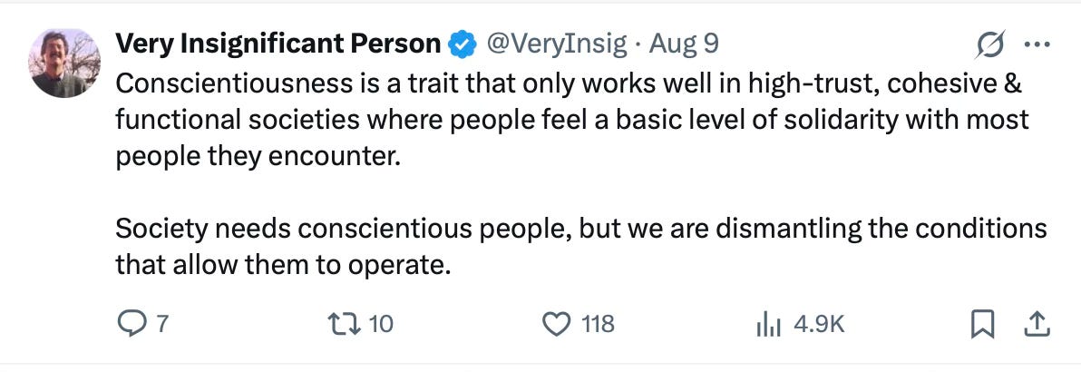Conscientiousness—being reliable, disciplined, and willing to see things through—is strongly tied to thriving in life. And yet, as Burn-Murdoch shows, it’s collapsing. Meanwhile, neuroticism—anxiousness, tension, and emotional volatility—is on the rise