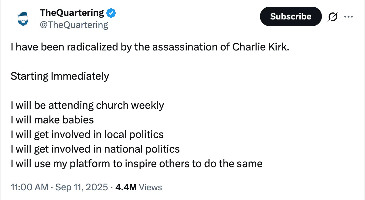 The hunger—for meaning, for truth, for family—is stirring in the next generation and Kirk spoke to it. His shocking murder might even spur many to action. Our culture’s rejection of God lead to moral relativism and then to nihilism, but many young people have had enough. Surveys show more young men want to get married and raise families. Versions of “having a baby restored my faith in humanity” pop up online. Younger generations are attending churches more faithfully than their grandparents. By God’s grace, ten will take Charlie Kirk’s place—and perhaps a hundred more beyond them.