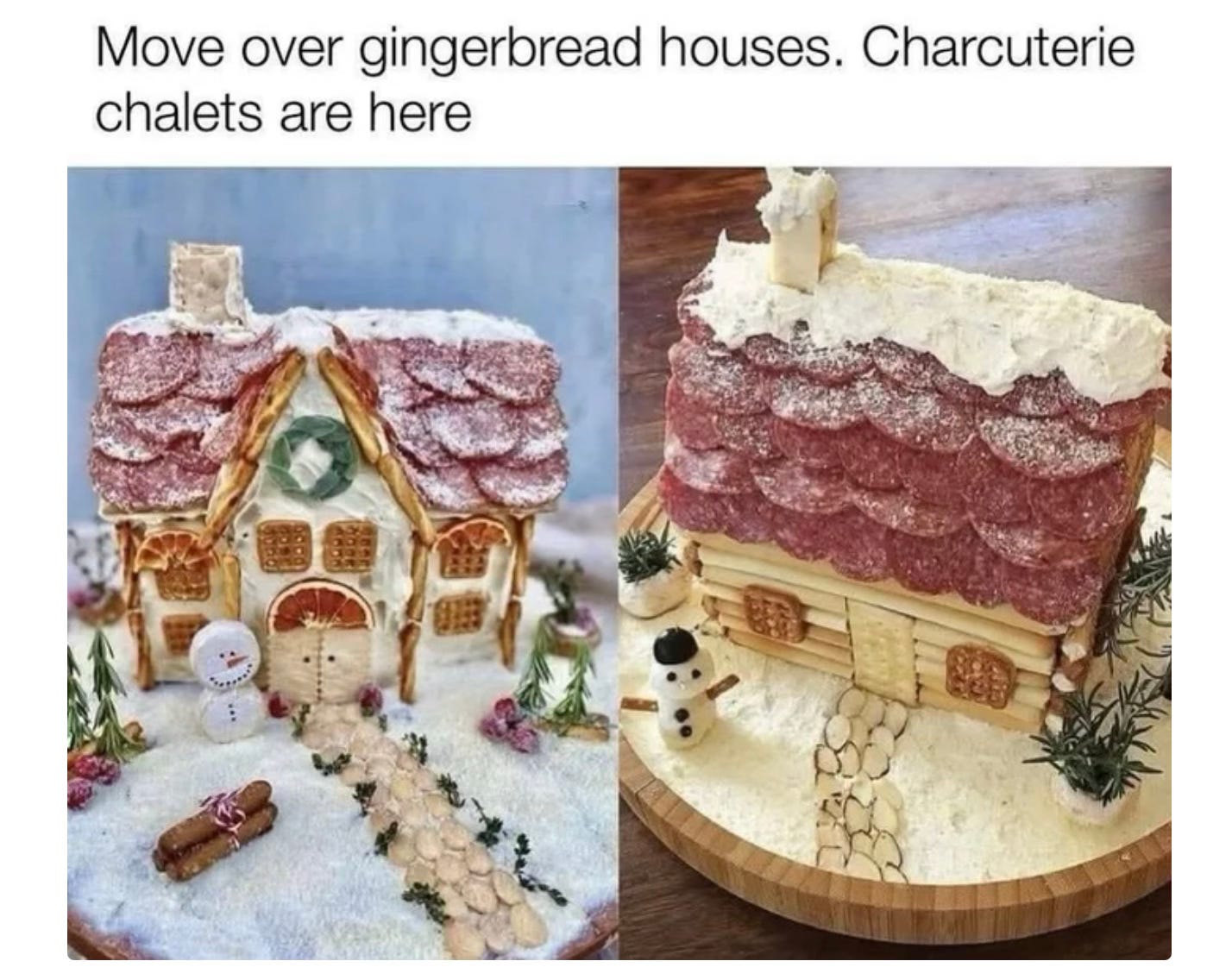 This year I encountered a new Christmas phenomenon: the “charcuterie chalet,” sometimes called a “meat mansion.” They’re festive little cabins made entirely of cured meats and cheese. They look fun and tasty.