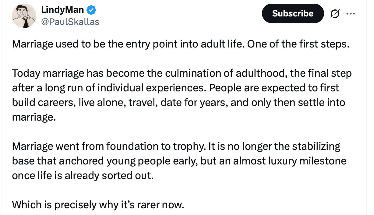 If this is what our culture has to say about marriage, no wonder young people put it off. It’s starting to feel like marriage has reverted to its pre-modern status: a luxury for the rich, who can afford both lavish weddings and the fallout of divorce if it all goes to vinegar. But Brad Wilcox at the Institute for Family Studies argues that marriage’s decline isn’t primarily economic. People stayed married through the Great Depression—when they were broke, hungry, and choking on dust storms—while the golden age of the 1990s saw a retreat from marriage. What changed wasn’t wealth but values: “The counterculture, sexual revolution, and rise of expressive individualism… undercut the norms, values, and virtues that sustain strong and stable marriages.” And while culture tells us to delay marriage until we’re “ready,” it is strangely silent about choices that actually raise divorce risk, “such as having multiple sexual partners before marriage and pre-engagement cohabitation”.