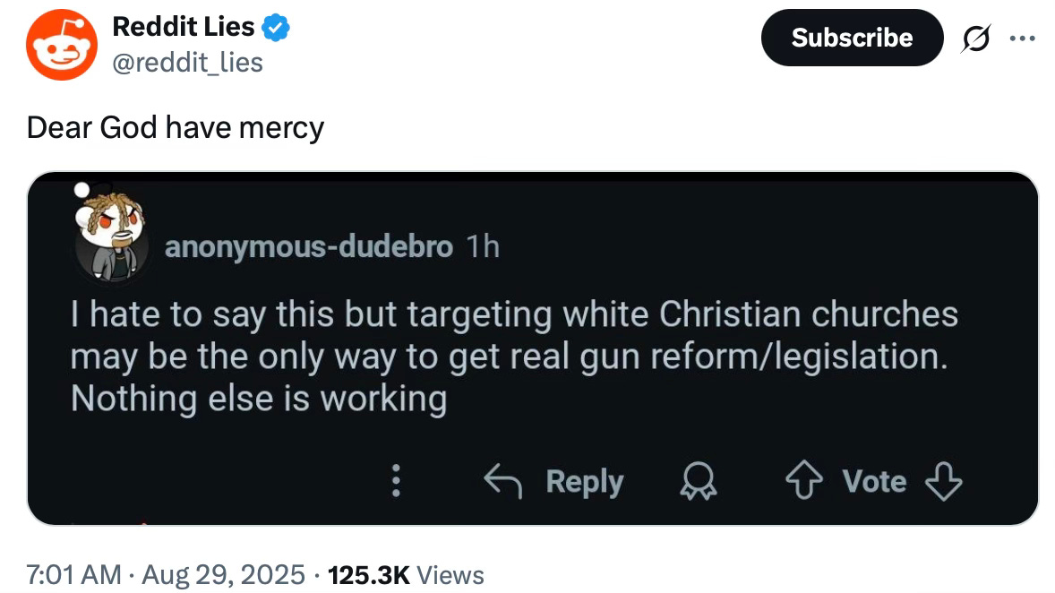 Meanwhile, the press twisted itself into knots to avoid “misgendering” the killer. Commentary Magazine noted the shift: in the past, outlets hid shooters’ names to deny them glory, which seems reasonable. But as Matt Continetti pointed out on the podcast, the policy now seems aimed at something else: “to shield the killer and to shield the community that the killer identifies with, which is a very different sort of thing.”