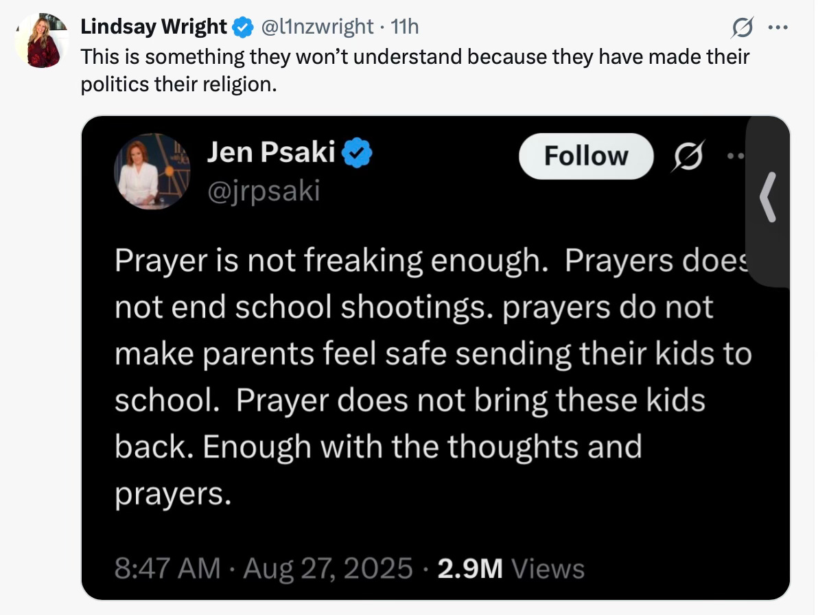 Senator JD Vance took up the defence of “thoughts and prayers” which so many godless and hopeless ones despise: